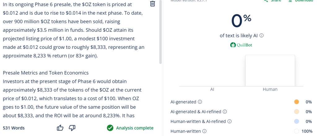 In its ongoing Phase 6 presale, the $OZ token is priced at $0.012 and is due to rise to $0.014 in the next phase. To date, over 934 million $OZ tokens have been sold, raising approximately $3.6 million in funds. Should $OZ attain its projected listing price of $1.00, a modest $100 investment made at $0.012 could grow to roughly $8,333, representing an approximate 8,233 % return (or 83× gain).