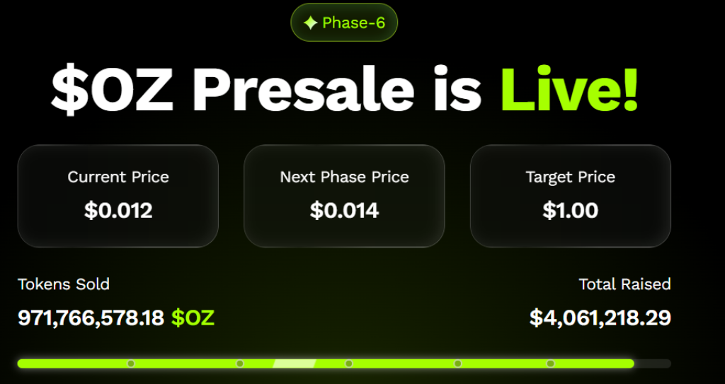 The OZ token presale is currently in its 6th phase; it’s only $0.012 per token for early adopters. This could be the best entry point before the next price jump. With over 971 million $OZ tokens having been sold, the 6th phase is going to end, and the next phase is priced at $0.014. The growth of this coin in the presale is