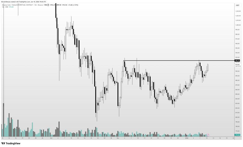 Altcoin Sherpa keeps the approach simple and disciplined. Rather than trying to predict the breakout, he’s waiting for confirmation. On the 12-hour chart, the BNB price is still capped by the same $923–$930 resistance that has stopped rallies several times.