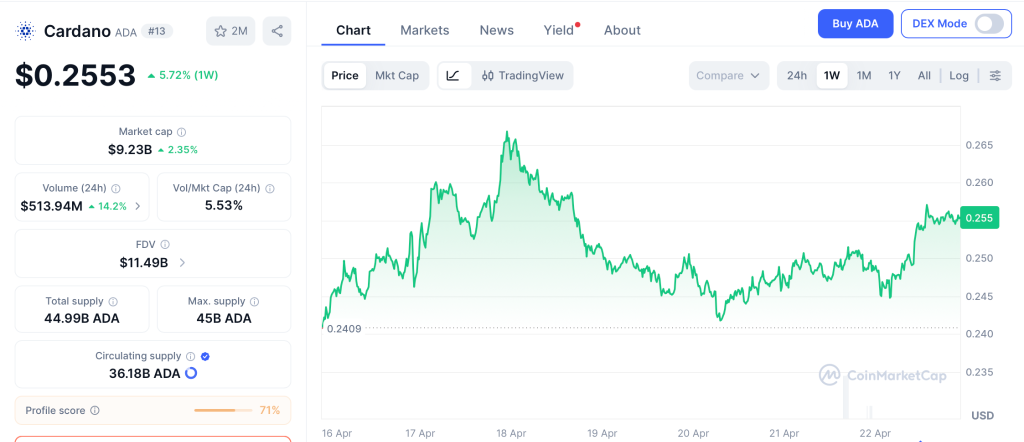 Cardano (ADA) trades at $0.25 with an $9.2 billion market cap per CoinMarketCap, with the network listing a $100 million reinsurance product on the LSE on April 19, four spot ETF filings from Grayscale, VanEck, 21Shares, and Canary Capital pending with the SEC, and whale wallets holding more than 10 million ADA climbing to multi-month highs per CaptainAltcoin.