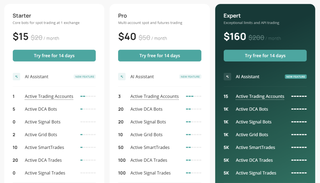 3Commas.io offers three standard tiers and pricing plans. They also have a custom, enterprise plan that requires direct contact with the team to arrange it.