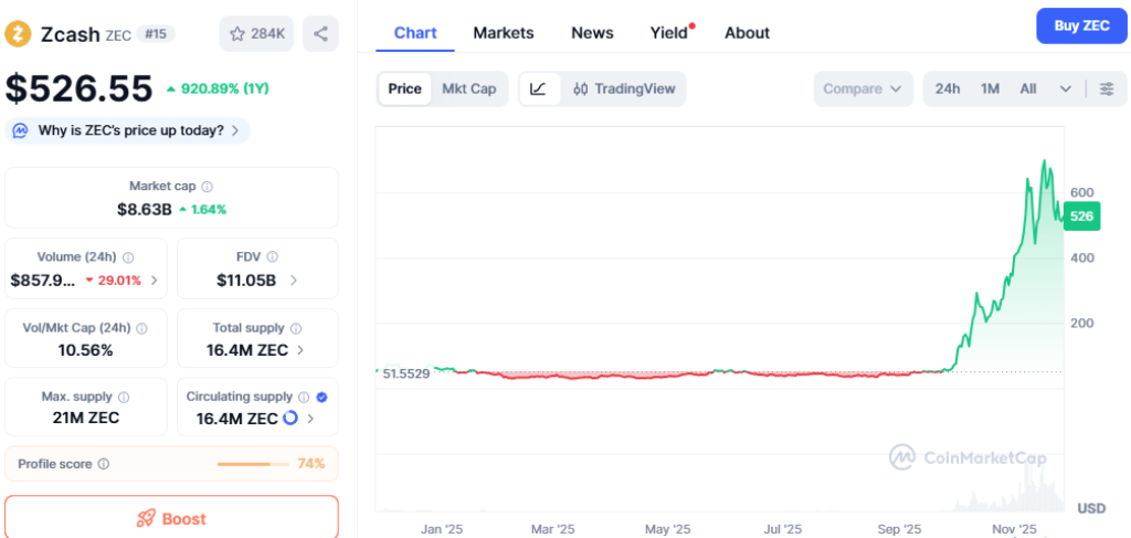 Q4’s biggest meta is “privacy coin,” with ZEC leading the line. The Zcash price increased by 1,100% over the past 90 days. It reached a peak price of $736 in early November, but it has since fallen below $550. Is this a discount, and is ZEC among the best altcoins to buy in November?