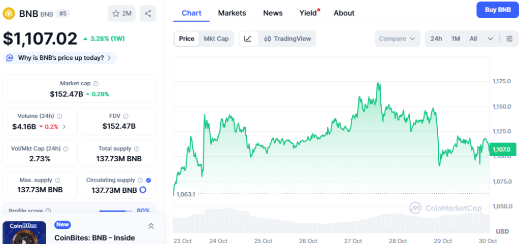 <blockquote class=”twitter-tweet”><p lang=”en” dir=”ltr”><a href=”https://twitter.com/search?q=%24BNB&src=ctag&ref_src=twsrc%5Etfw”>$BNB</a> broke its multi-year trendline back in July and never looked back<br><br>Up over 600% since the bear market bottom<br><br>And now firmly in price discovery mode<br><br>Next major Fib targets:<br>- $1,486 for 2.618<br>- $1,983 for 3.618<br><br>Can it hit $2,000 before the end of the year? <a href=”https://t.co/Omk8biM7Df”>pic.twitter.com/Omk8biM7Df</a></p>— Lark Davis (@TheCryptoLark) <a href=”https://twitter.com/TheCryptoLark/status/1975901547201511655?ref_src=twsrc%5Etfw”>October 8, 2025</a></blockquote> <script async src=”https://platform.twitter.com/widgets.js” charset=”utf-8″></script>