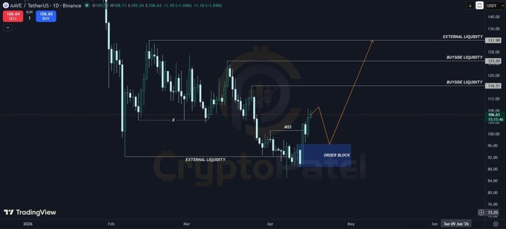 We had a look at the AAVE chart from Patel, and the structure is textbook. The AAVE price is trading near $106.65. The chart shows a clear market structure shift confirmed, marked as MSS on the chart. That means the downtrend has ended and a new uptrend has started.