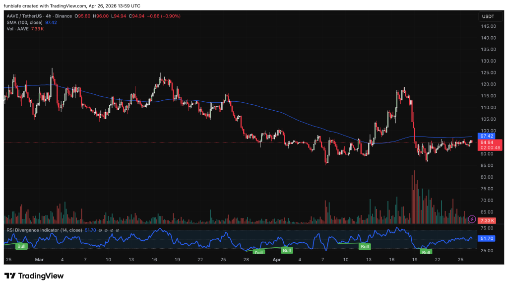 The AAVE price has been trading below that level for several days. The support below sits at $94, then $90, then $85. The resistance above sits at $97.50, then $100, then $105. The RSI divergence indicator is at 51.70, neutral.