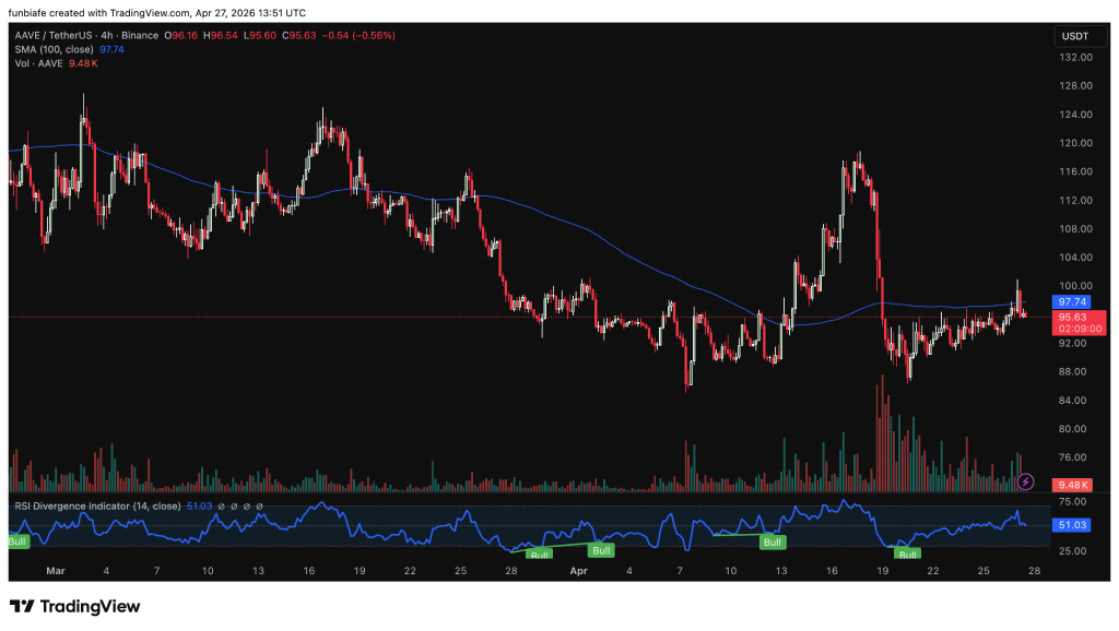 One key level stands out, the 100-period SMA at $97.74. The AAVE price has been struggling to get back above it, and every attempt has been pushed down. Until that changes, the short-term outlook stays a bit weak.
