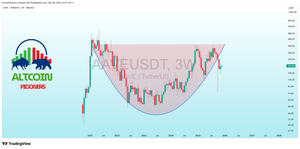 From the highs of 2021 to the lows of 2024, Aave price carved a massive cup on the 3-week chart. This formation isn’t just a shape; it represents years of market psychology.