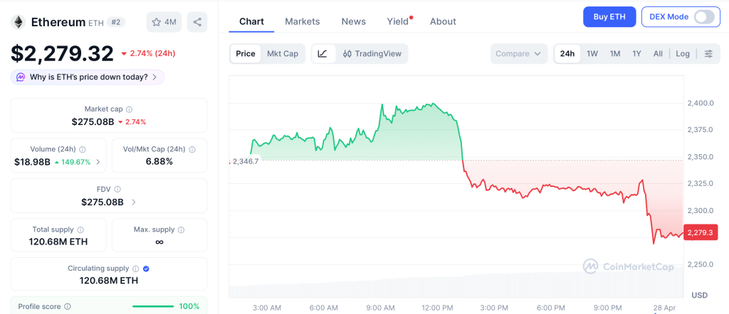 Ethereum (ETH) trades near $2,279 after a $75.9 million ETF outflow on April 23 ended a ten-day inflow streak, according to CoinMarketCap.