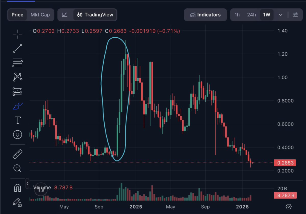 The other obvious detail is the contrast between the rally phase and the decline phase. The rally into the $1.00–$1.40 region was sharp and emotional, but the move back down has been slower and more grinding, which is typical when a market bleeds after a blow-off move. That kind of structure often leaves behind a “memory zone” where buyers step in again, even if the bounce starts ugly.