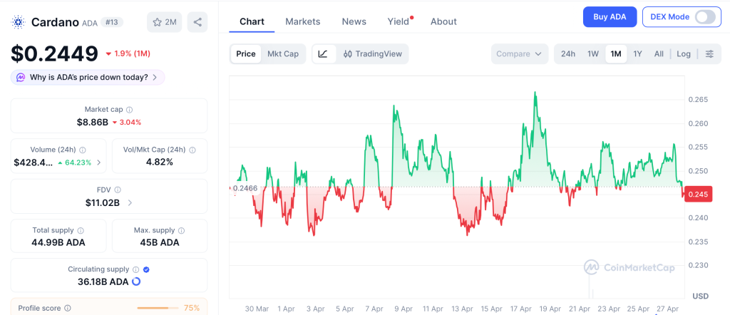 ADA trades near $0.244, with the closest support holding around $0.24 to $0.244 according to CoinMarketCap. A push above $0.26 would strengthen the case for a trend shift, but that resistance zone has remained a ceiling through April as rallies kept stalling underneath it.