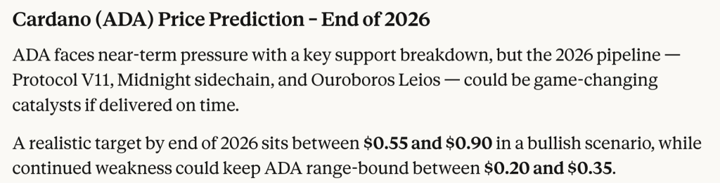 If the ADA price wants to build a stronger structure, it needs to break back above $0.30 and start forming higher lows above $0.28. If $0.24 gives way again, downside pressure could pick up. Claude’s $0.55 to $0.90 projection for 2026 assumes a broader recovery and strong execution on Cardano’s roadmap. Right now, ADA is still in repair mode.