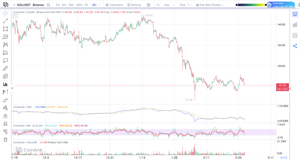 The SOL price trades near $81 after falling hard from a peak close to $148. The drop was aggressive, cutting through support levels before finally bottoming around $67. Since then, the SOL price has been moving sideways between roughly $75 and $90. That range tells the story.