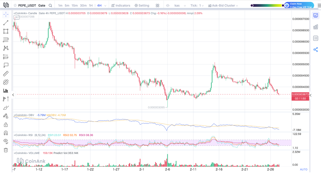 The PEPE price is trading around $0.0000036 after sliding from its early February highs. The 4-hour structure shows repeated lower highs, and a quick spike toward $0.0000050 was rejected almost immediately. That rejection indicates the heavy supply above.