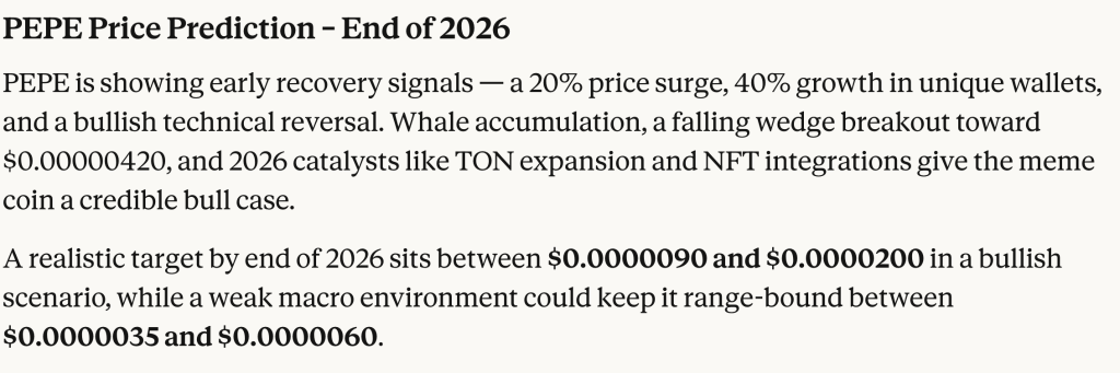 On the flip side, the PEPE price would need to reclaim $0.0000045 to show buyers are serious again. Claude’s projection between $0.0000090 and $0.0000200 by 2026 assumes meme appetite and liquidity return in full force. At this stage, PEPE looks more like it’s stabilizing than reversing.