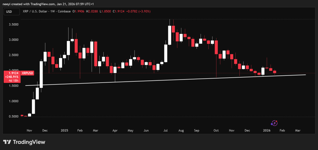The longer-term XRP price structure adds another layer of confidence. On the weekly timeframe, Ripple price has been bouncing along a rising trendline that began forming in early 2025. Every major pullback since then has respected that upward slope, creating a sequence of higher lows even while price moved sideways.