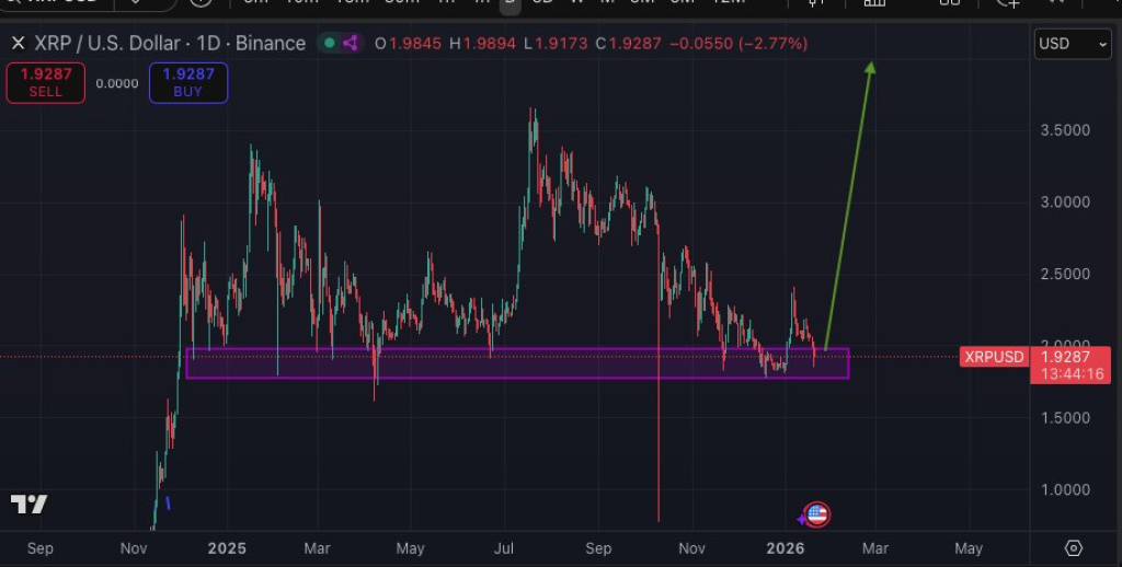 The current XRP price sits around $1.92, pressed tightly into a zone that has quietly shaped Ripple price behavior for more than a year. What looks boring on the surface is beginning to look important underneath.