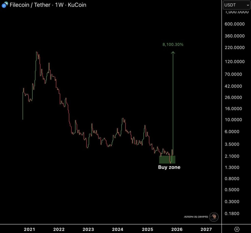 In his view, the Filecoin price is entering a spot where outsized gains can happen quickly if momentum flips. His projection shows a massive potential upside, more than 8,100%, and while that’s obviously an extremely bold target, it explains why this area has so many eyes on it.