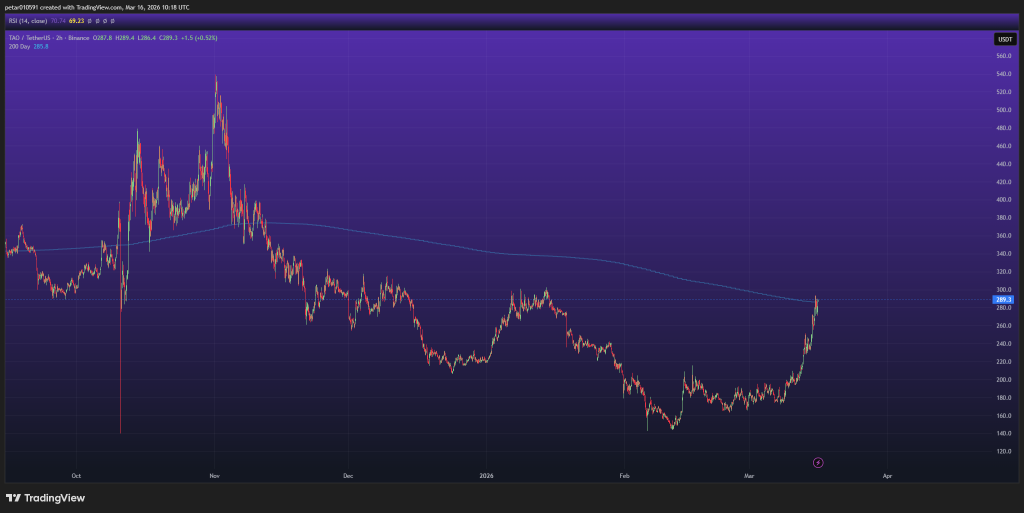 The 200-day moving average sits at $285.8. The TAO price is now trading just above that at $289.3. Holding above the 200-day MA is a big deal. It signals the longer-term trend is turning bullish.