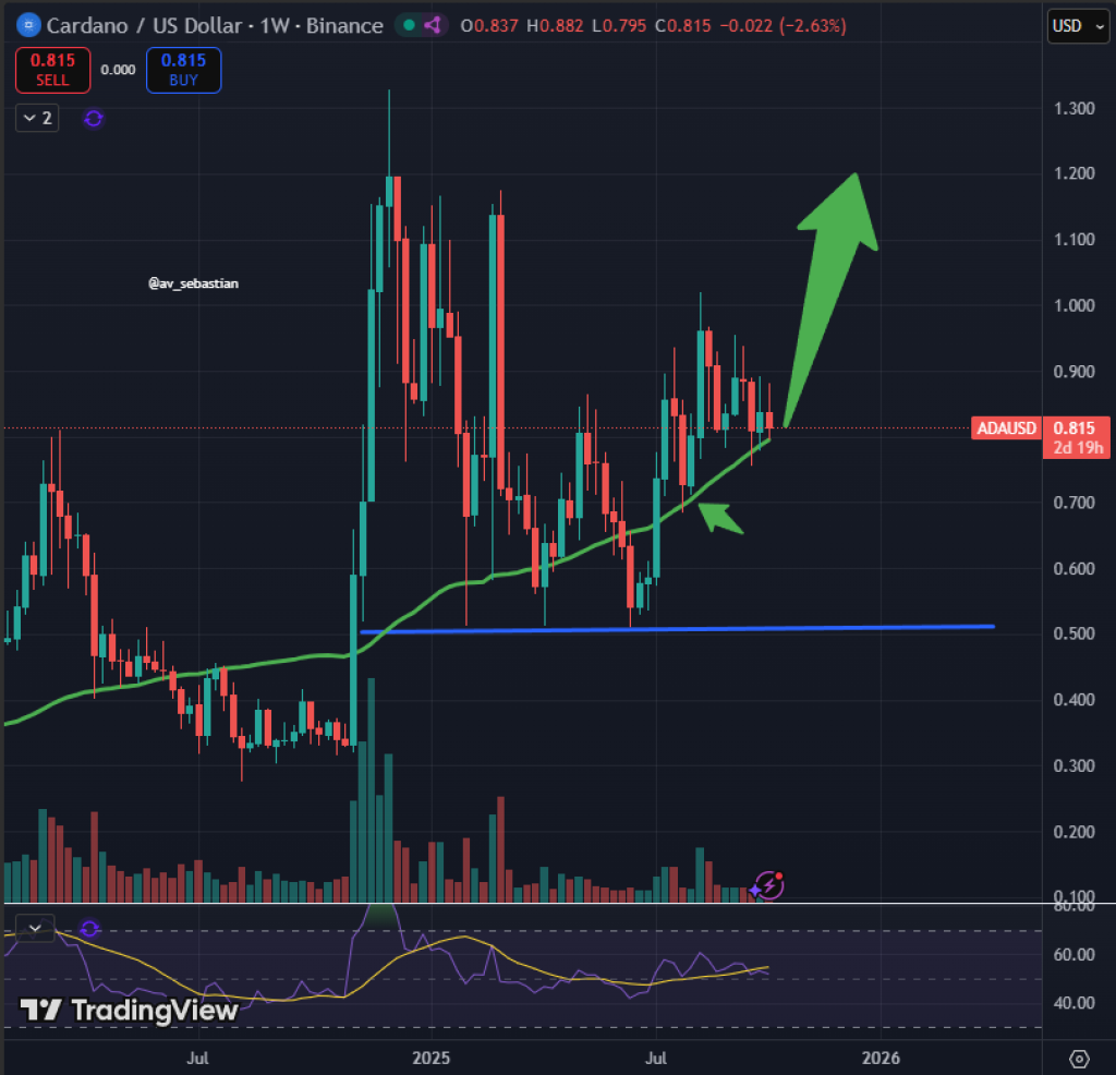 According to AV Sebastian, ADA 50-week moving average is holding strong around the $0.80 zone, and that’s exactly where big moves have started in the past. He even said, “When $ADA bounces from here, it might be the move we’ve all been waiting for.”