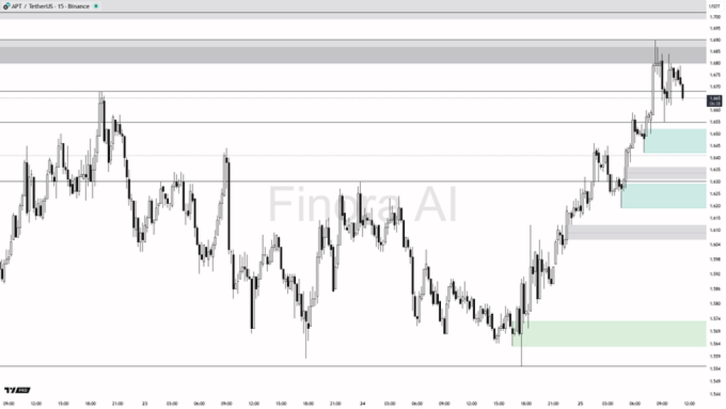 On the 15m chart, the APT price remains in an uptrend with higher highs and higher lows. However, price is now stalling just below the most recent swing high. This is often where early buyers start taking profits, especially after a fast move up.
