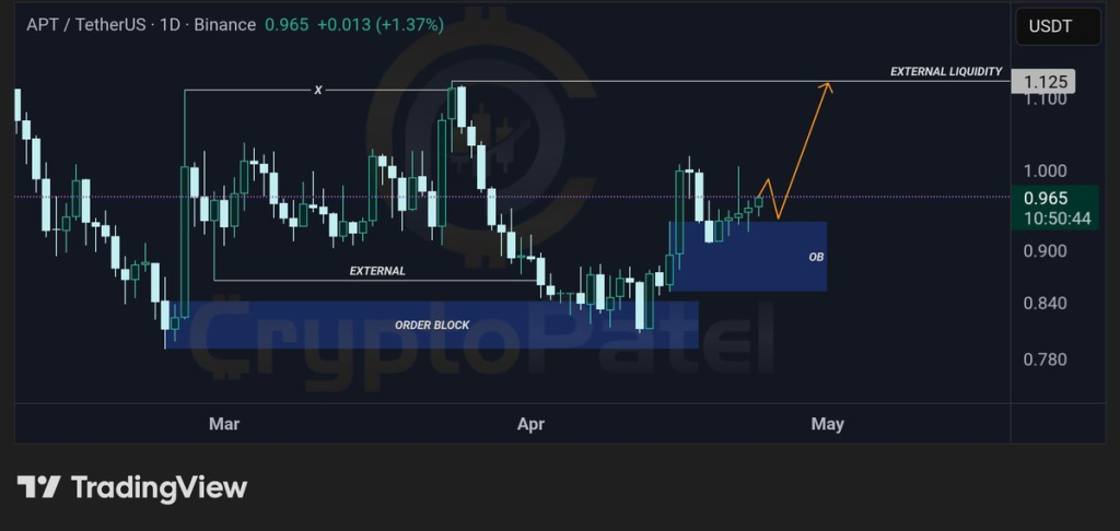 Crypto Patel explains that Aptos tapped into a higher timeframe order block, which acts as a demand zone where buyers previously stepped in. Price did not stay there for long. A strong reaction followed, and that reaction matters because it shows buyers were ready at that level.