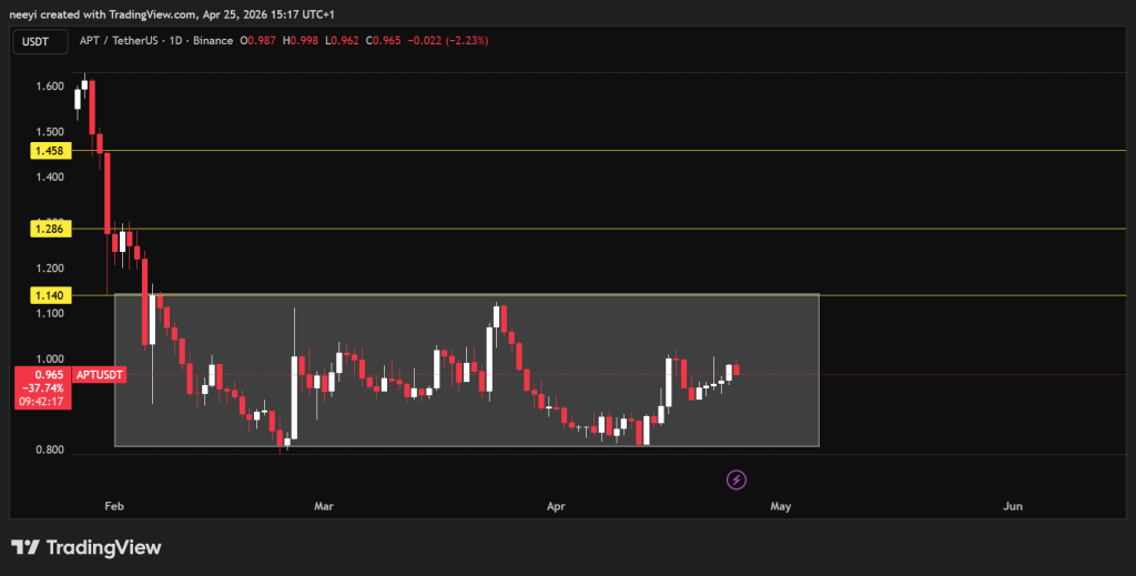 Aptos price has spent several weeks moving within a defined range, and that context cannot be ignored. The $1.14 region has acted as a strong resistance area during that period. Price has tested it multiple times without a clean breakout.