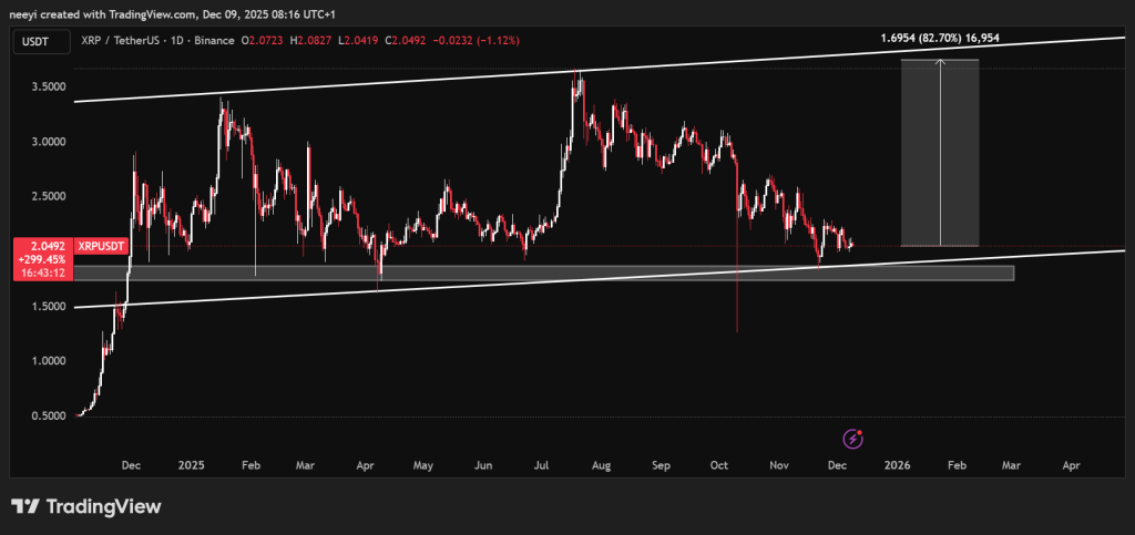 XRP trades around $2.04 and sits on a horizontal support that has held since December 2024. The XRP token has bounced off this zone many times for almost a year. Every touch created a reaction, and the market never managed to break through it with conviction. This history makes the level a natural area buyers tend to revisit.