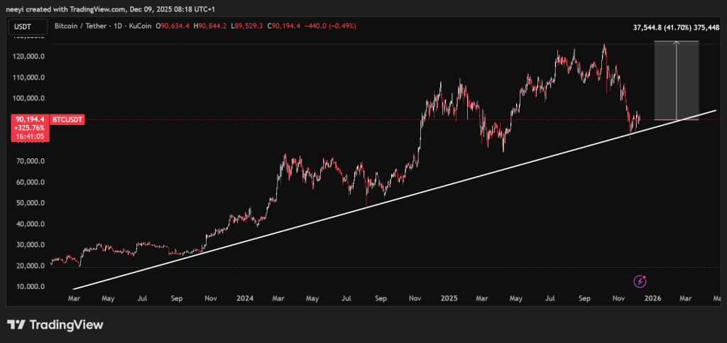 BTC trades near $90,000 and rests on a trendline that has guided the uptrend since early 2023. Every major pullback paused on this line. Each time Bitcoin touched it, BTC price formed a higher low and created the next leg toward fresh highs. The current position mirrors those moments.