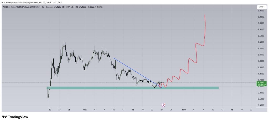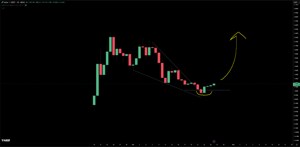 TraderSZ’s daily chart gives a clearer picture. After spending most of October inside a falling wedge, ASTER price finally broke out of it and started forming a rounded bottom around $1.05-$1.10.