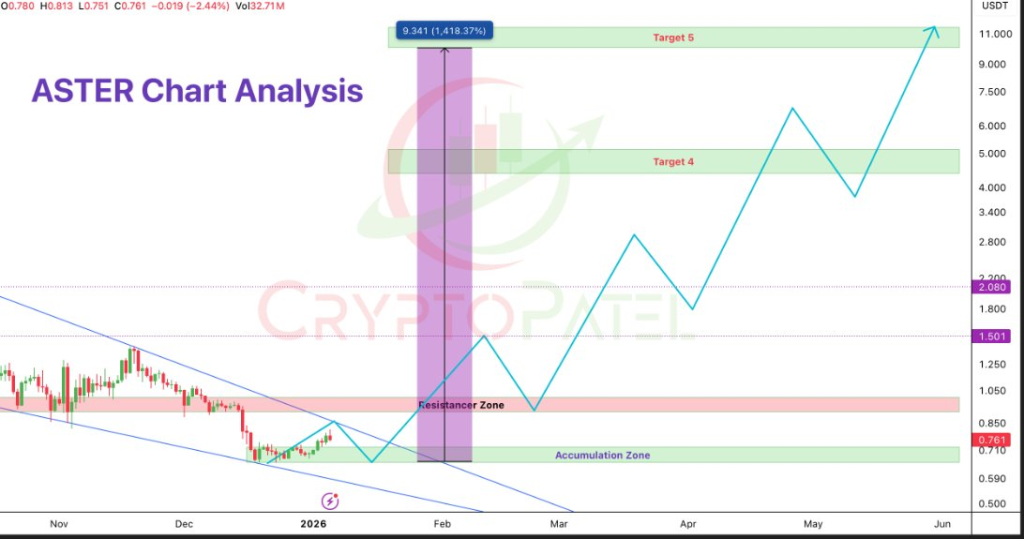 ASTER price has spent weeks compressing inside a broad descending structure before stabilizing near the accumulation zone highlighted on the chart. Price holding around $0.75 to $0.80 aligns with what CZ fan Daivik describes as a reset phase driven by token unlock pressure and macro uncertainty rather than structural weakness.
