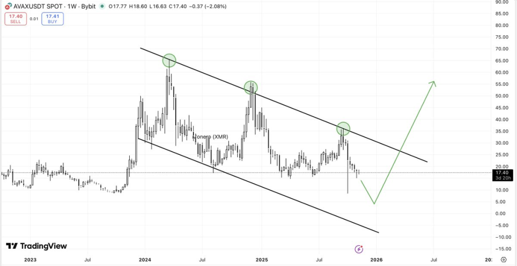 AVAX continues trading in a long-term descending channel, with support around $10–$12 and resistance near $37–$40. (Source: X)