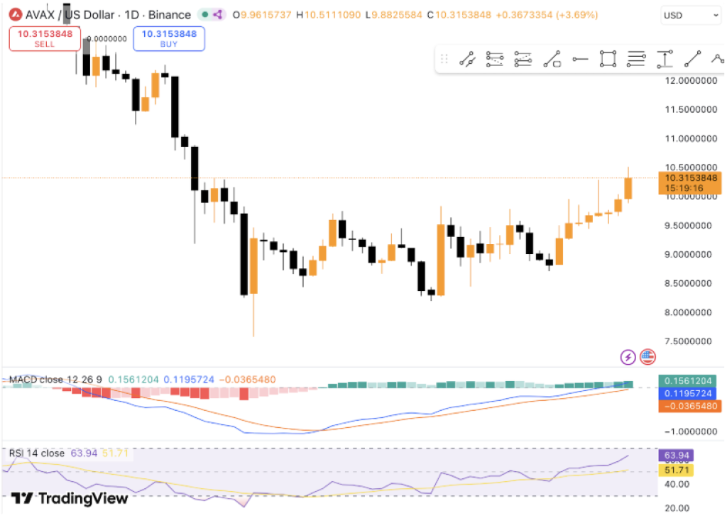 Avalanche is back in focus after a strong move higher lifted AVAX above the $10 mark, a level traders had been watching closely. After holding steady for several sessions in the $8.30 to $8.50 area, the token broke out and managed to stay near $10.30, a sign that short-term sentiment has shifted in favor of buyers.