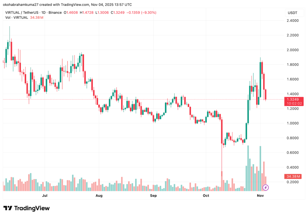 The sentiment is neutral, and its 14-day RSI is in a healthy range, indicating no extreme buy or sell pressure. The price prediction for VIRTUAL is also strong, with forecasts pointing to a 115% rise by November 2026. It stands as a solid performer in the AI space, but its larger size means its days of massive gains are likely in the past.