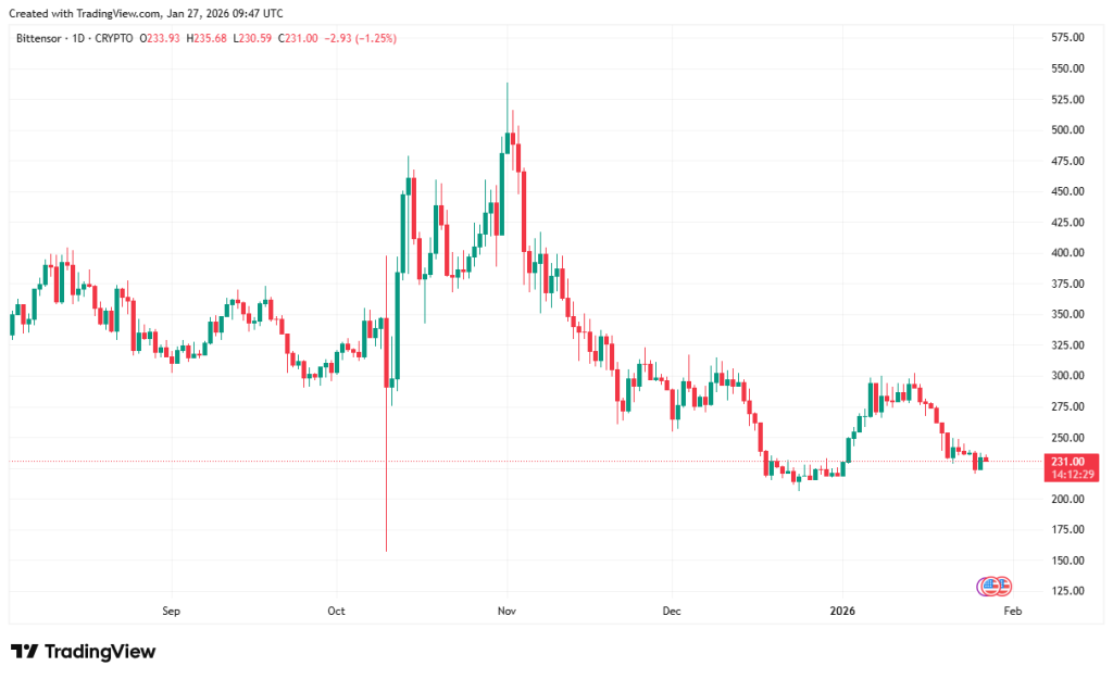Bittensor is a top AI crypto following its first halving, which reduced daily TAO issuance from 7,200 to 3,600 tokens. TAO currently trades at $231, with projections suggesting a possible rise to $563 by late 2026.