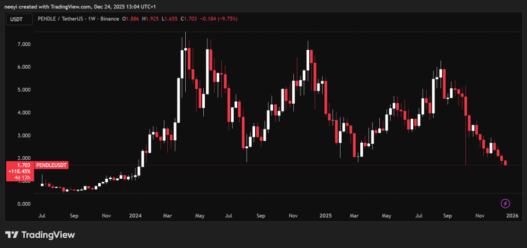 PENDLE currently trades near $1.7 to $1.8, with sentiment stuck in extreme fear despite forecasts placing fair value much higher later in the cycle. That disconnect often appears during bear markets when fundamentals improve quietly while price lags behind. Infrastructure plays like this tend to benefit when DeFi activity and institutional yield strategies return.