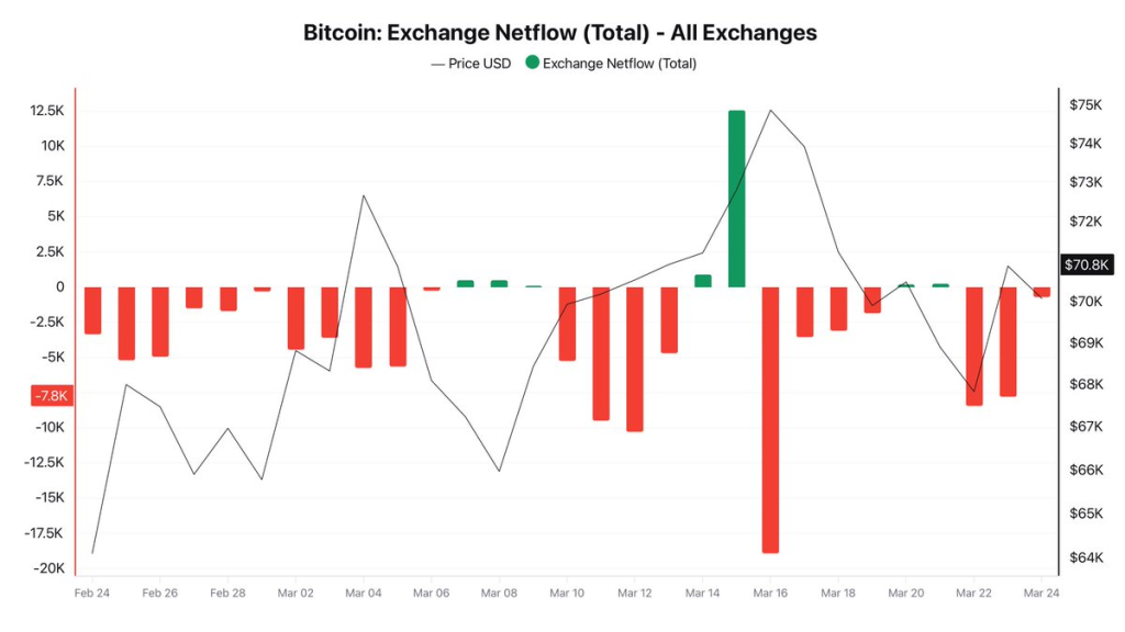 According to a CryptoQuant analyst named Darkfost, the net outflow of Bitcoin from exchanges over the past month proves that heavy accumulation is happening right now. Aside from one quick spike when the asset tapped $76,000 on March 17, billions of dollars are leaving exchange platforms.
