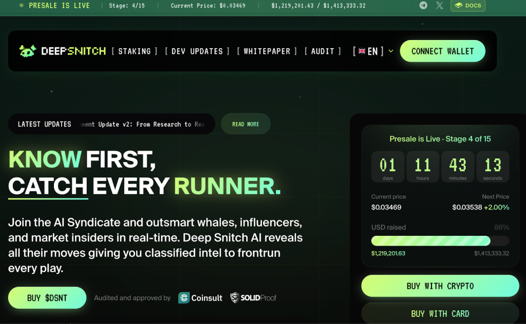 Best crypto presale: Traders rush to DeepSnitch AI as 100x rumors grow with launch looming