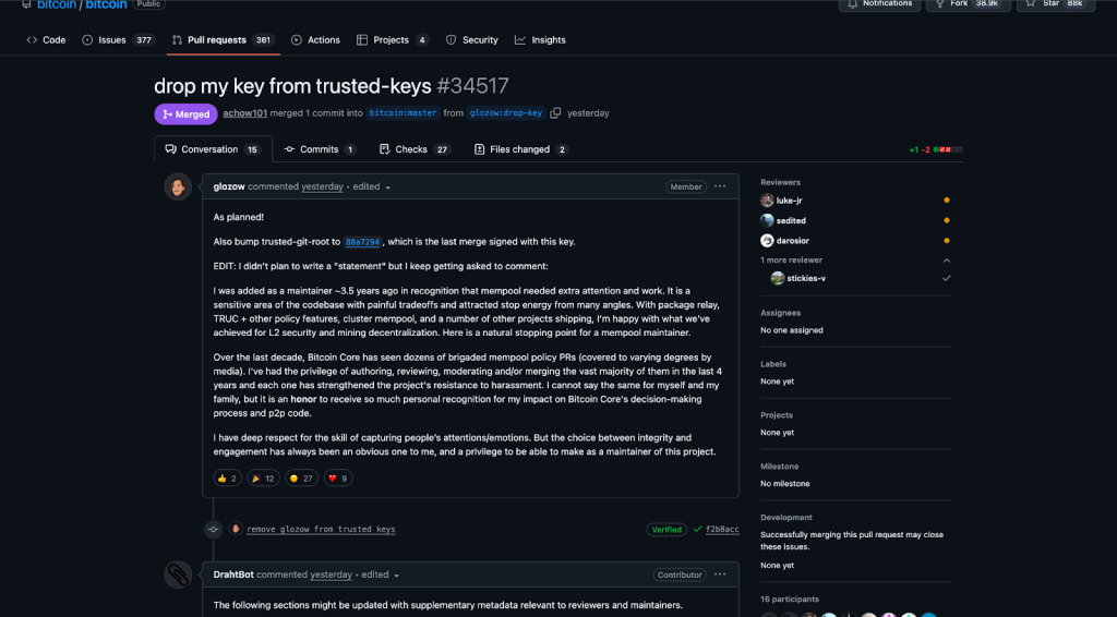 She submitted her last pull request to the Bitcoin GitHub repository, removing her PGP key from the trusted keys and withdrawing herself from the small circle of maintainers able to update Bitcoin’s software. While this demonstrates the decentralized resilience of Bitcoin, it also highlights the maturity of the asset.