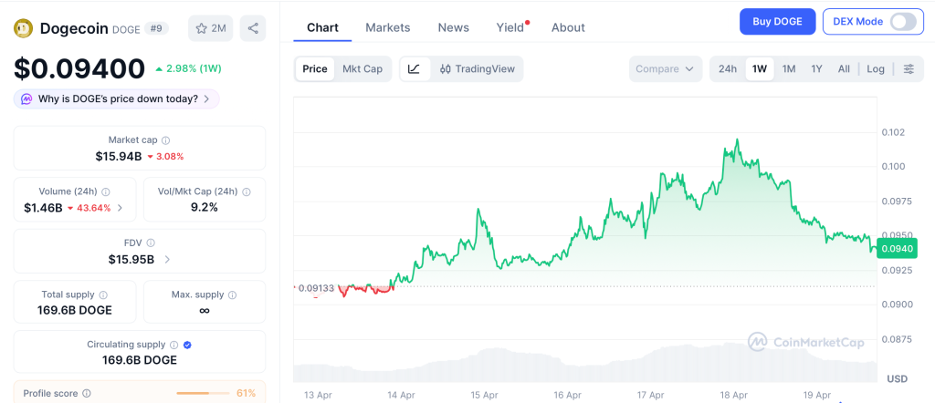 Dogecoin changes hands at roughly $0.94 up 2.98% this week according to CoinMarketCap, with a market cap above $15.94 billion and no catalyst calendar through April.