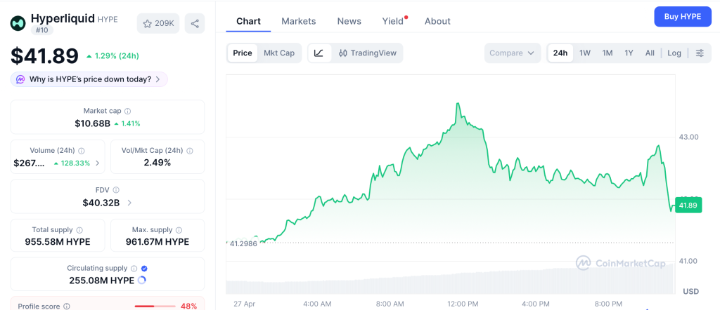 Hyperliquid (HYPE) trades at $41.89 according to CoinMarketCap, up 1.29% in 24 hours with support near $40 and resistance between $44 and $46.