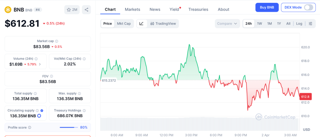 According to CoinMarketCap, BNB sits at $612 while the broader market corrects around it.