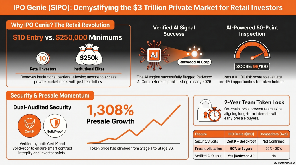 IPO Genie has dual CertiK and SolidProof audits, a verified AI deal signal (Redwood AI Corp.), 50% token allocation to presale buyers, and the lowest private market entry point in Q2 2026 at just $10.