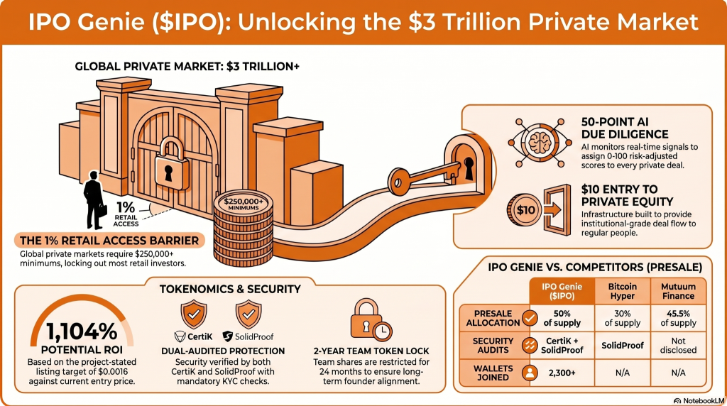 The value creation happened privately, and every day, investors watched it from the outside. This is the specific problem that IPO Genie ($IPO) is building Web3 infrastructure to solve, tokenized assets and real-world asset (RWA) crypto access for regular people, at a $10 entry point.