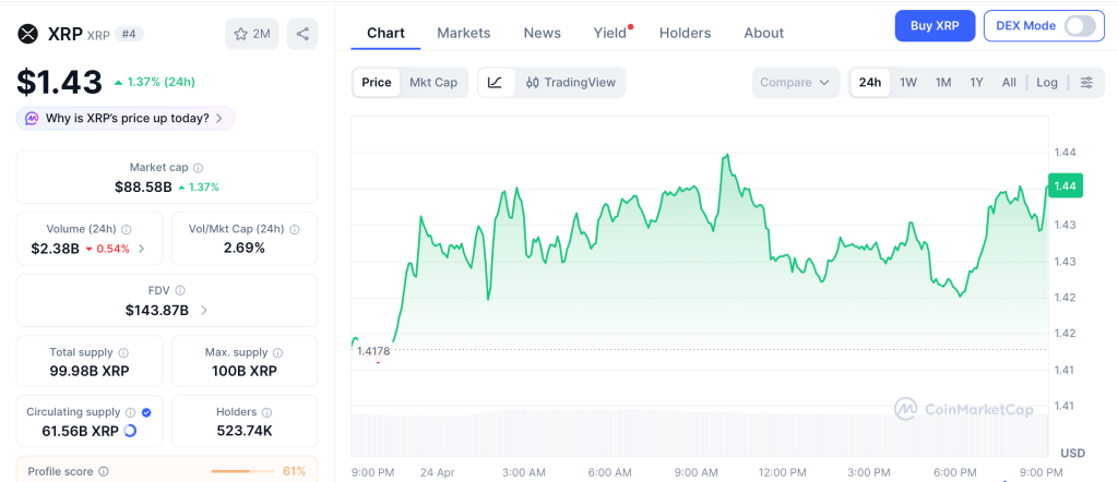 XRP traded near $1.43 in April, up 1.22% in 24 hours with a market cap above $88 billion according to CoinMarketCap. Technical analysis from UseTheBitcoin flagged $1.40 as support with $1.60 as the next target.