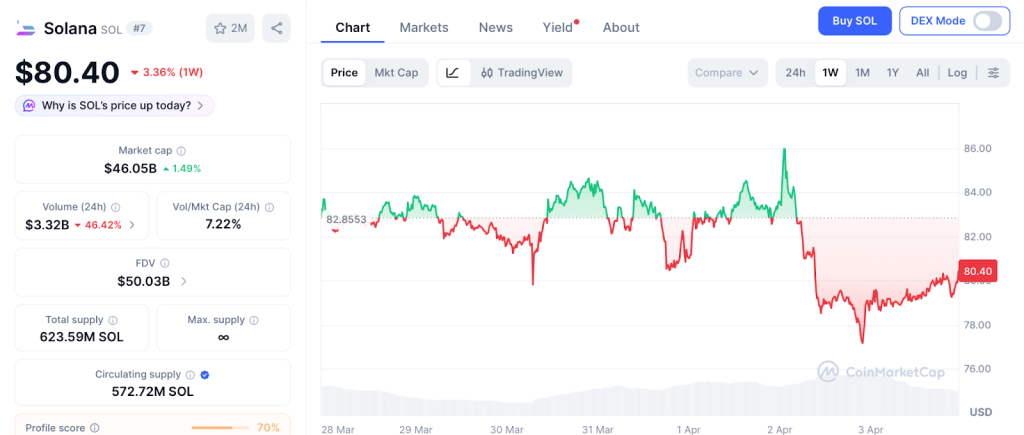 SOL sits at $80.40, down 3.36% on the week after the $285 million Drift exploit per CoinMarketCap. Support at $75, resistance at $88.