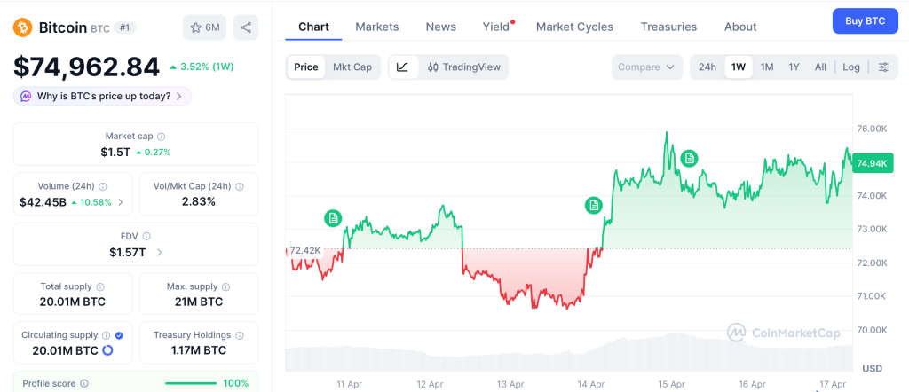 Bitcoin (BTC) trades at $74,963 with resistance at $76,016 according to CoinMarketCap. The Bull Score Index jumped from 10 in March to 40, and exchange reserves hit a 7-year low at 2.21 million BTC.