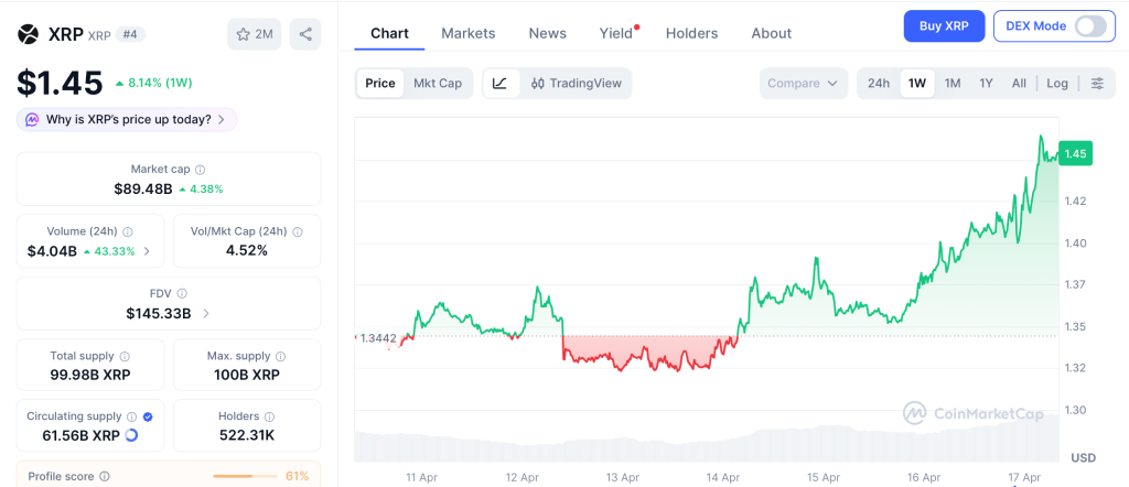 XRP trades near $1.45 after gaining 3.4% over the past week according to CoinMarketCap, but the coin remains below the $2.00 level it held in January.