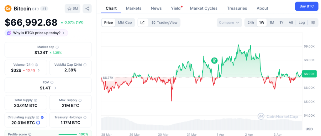 Bitcoin trades near $66,992 after closing Q1 with a 23.8% loss, its worst quarterly performance since 2018, according to CoinMarketCap. Corporate treasuries collectively hold over 1.1 million BTC, roughly 5% of total supply.