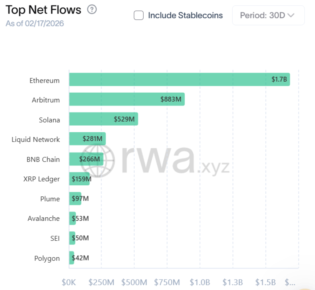 The surge in tokenized asset value rose across all major blockchain networks tracked by RWA.xyz. Ethereum led the surge with $1.7 billion in net growth, while Arbitrum reported $883 million and Solana at $529 million. This surge means more tokenized securities are being brought onto public blockchains as the RWA market continues to grow.