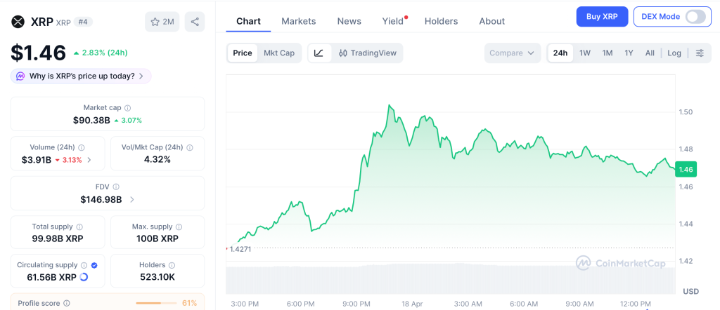 XRP (XRP) trades at $1.46 according to CoinMarketCap, after ripping 2.83% higher on April 18, tagging an intraday high of $1.511 as Rakuten backing and fresh ETF capital drove momentum past the breakout level.